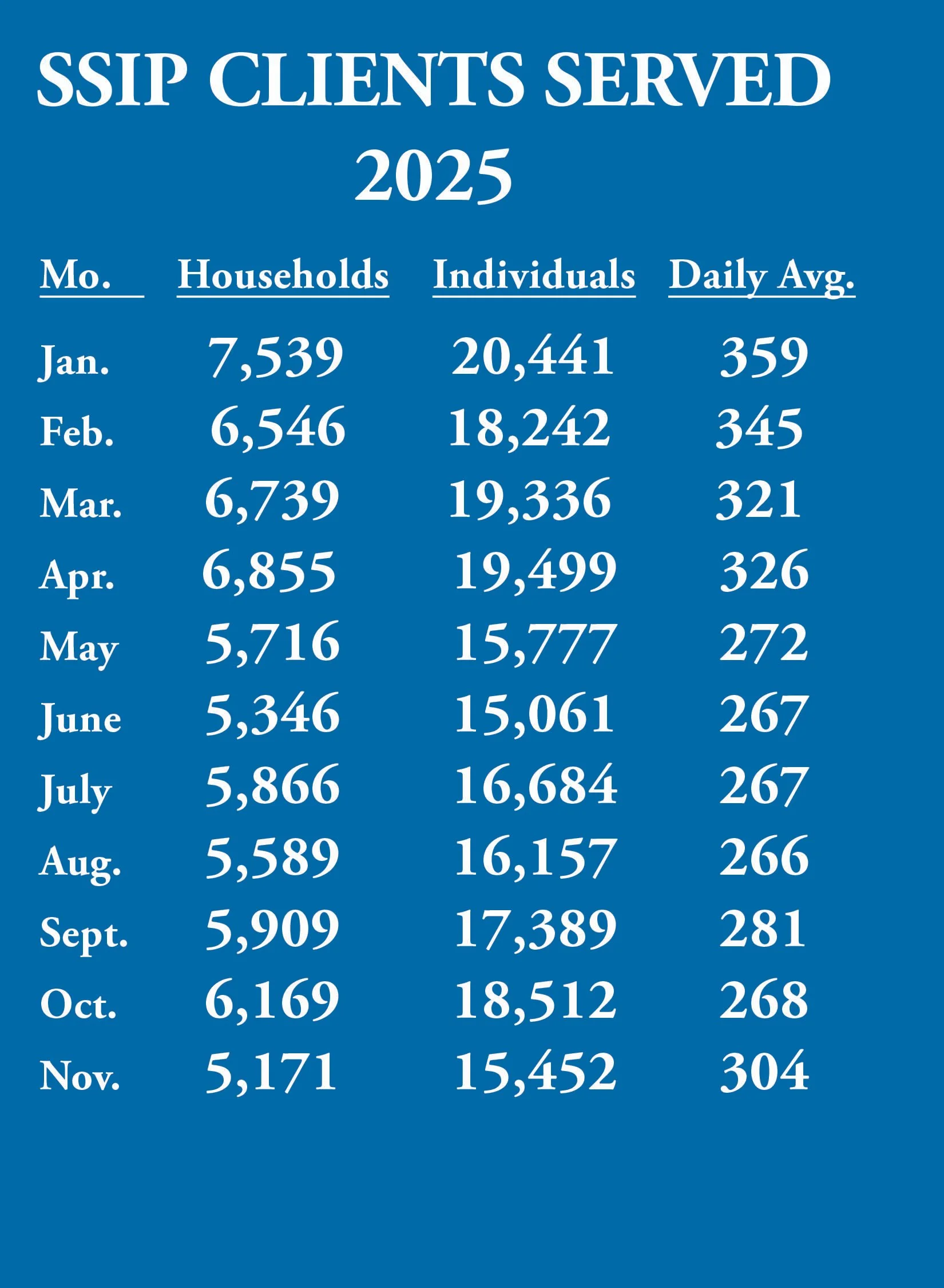 Immediately below, you’ll find current metrics showing households and individuals served at the SSIP Food Closet during the months of January-November 2025. You’ll also find two graphs displaying our phenomenal growth over the last five years.